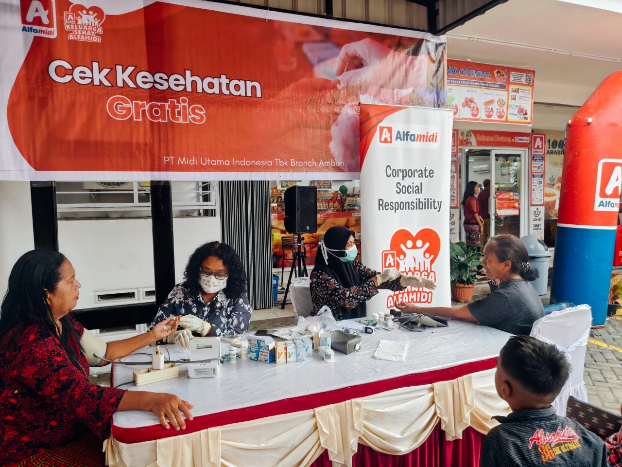 Mendorong kesehatan masyarakat dan pencegahan penyakit sejak dini, PT Midi Utama Indonesia Tbk (Alfamidi) Cabang Ambon menggelar pemeriksaan kesehatan gratis di Kairatu, Kabupaten Seram Bagian Barat pada (28/8/2025). Pelaksanaan cek kesehatan gratis bagian dari corporate social responsibility (CSR) ini digelar bersamaan dengan pembukaan gerai baru Alfamidi di kawasan tersebut.  Sebanyak 80 warga
